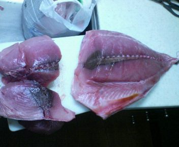 これ、おくってもらったんですけど、まぐろだか、かつをだか、解らなくて、しかもどう料理していいかわからない(^-^;刺身で食うか、何人前とれるんだろう。あと半分あるんだけど(--;)