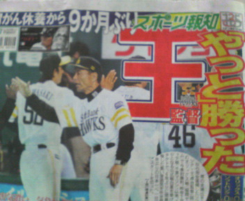 おはようございます、二日間のご無沙汰でした(^-^)昨日やっとソフトバンク勝ちました(^-^)この間、斎藤和巳投手紹介しましたが、三月二十四日開幕投手としてマウンドにあがりましたが〓まけてしまいました、実は、会ったときに、その日は、うち、結婚記念日なんで絶対勝ってよって言ったんだけど、それがまずかったのかなあ、でも勝ててよかったです、なに?いつからソフトバンクフアンかって、ははは(^-^)斎藤投手とあってからです、ちなみに、昨日、39度の熱がでました、もちろん鉄人ですから大丈夫ですけど(--;)これから、ワイドショーのロケ頑張ります(^-^;